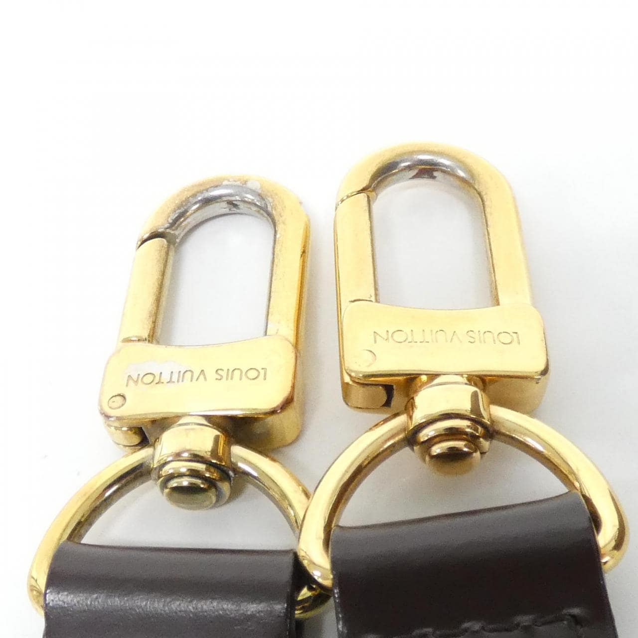 1 zippered pocket. Includes strap, clochette, and key. A clean used item with minimal signs of use. There is partial rubbing, darkening, minor scratches, and tarnishing.
